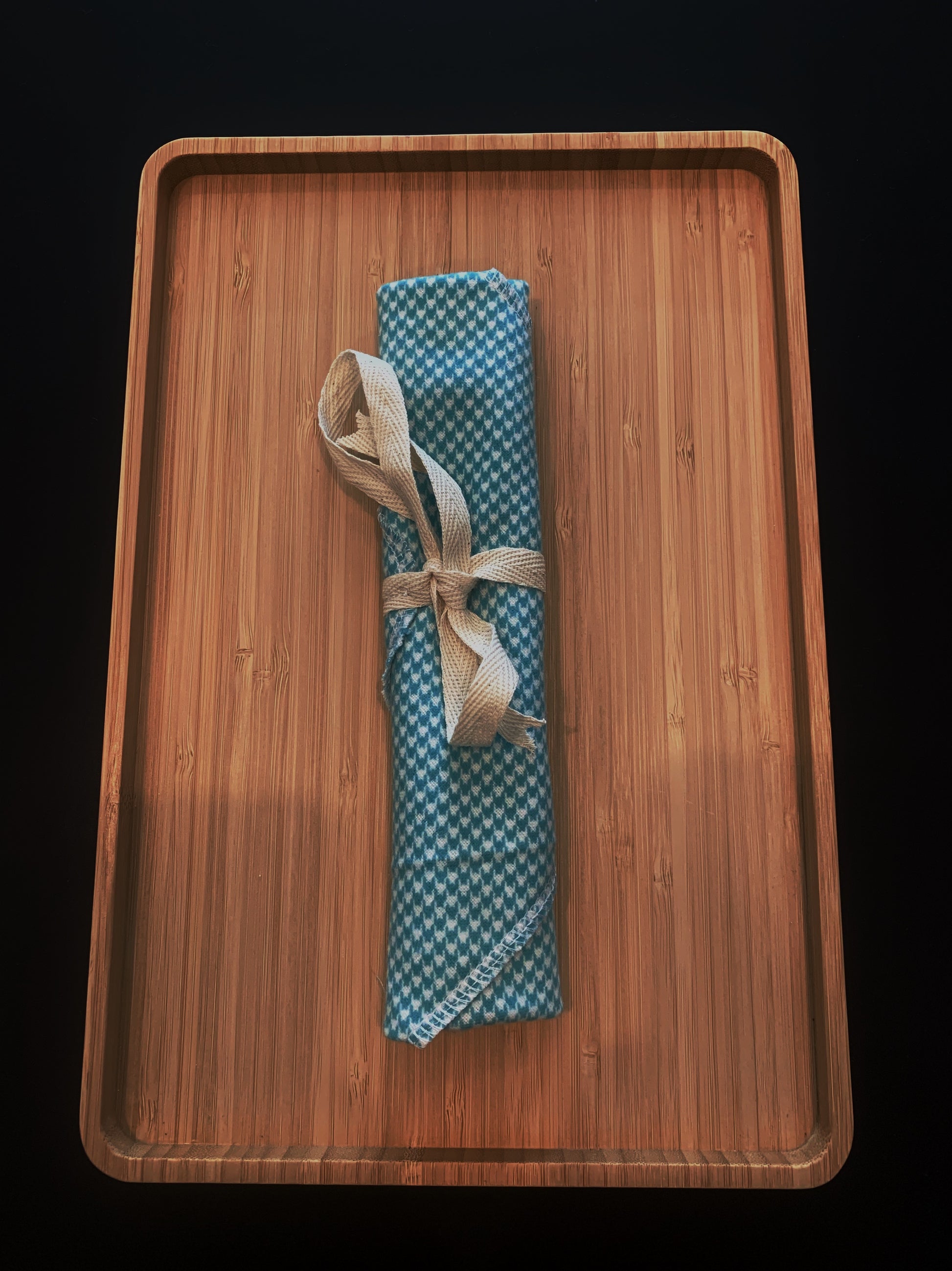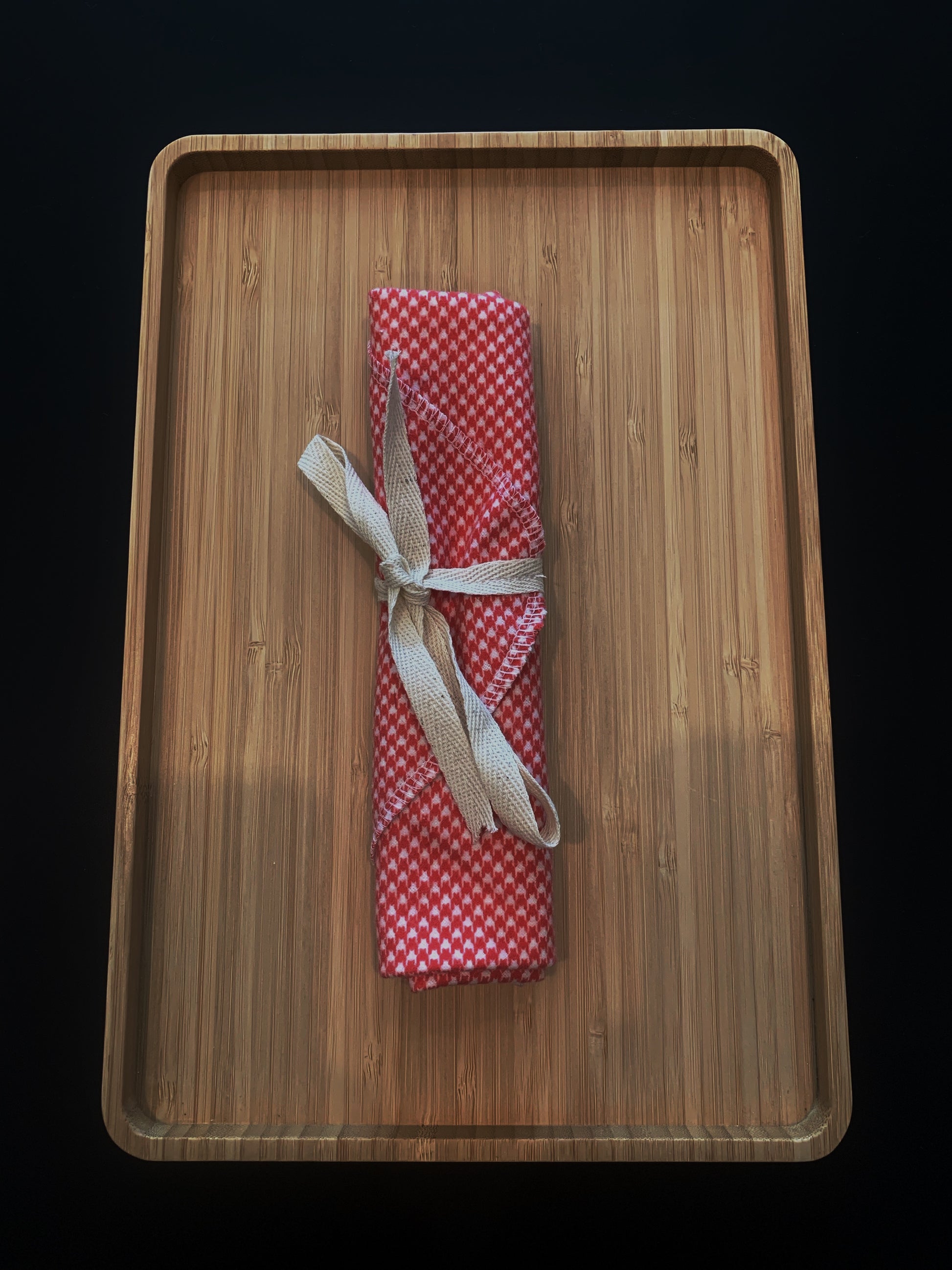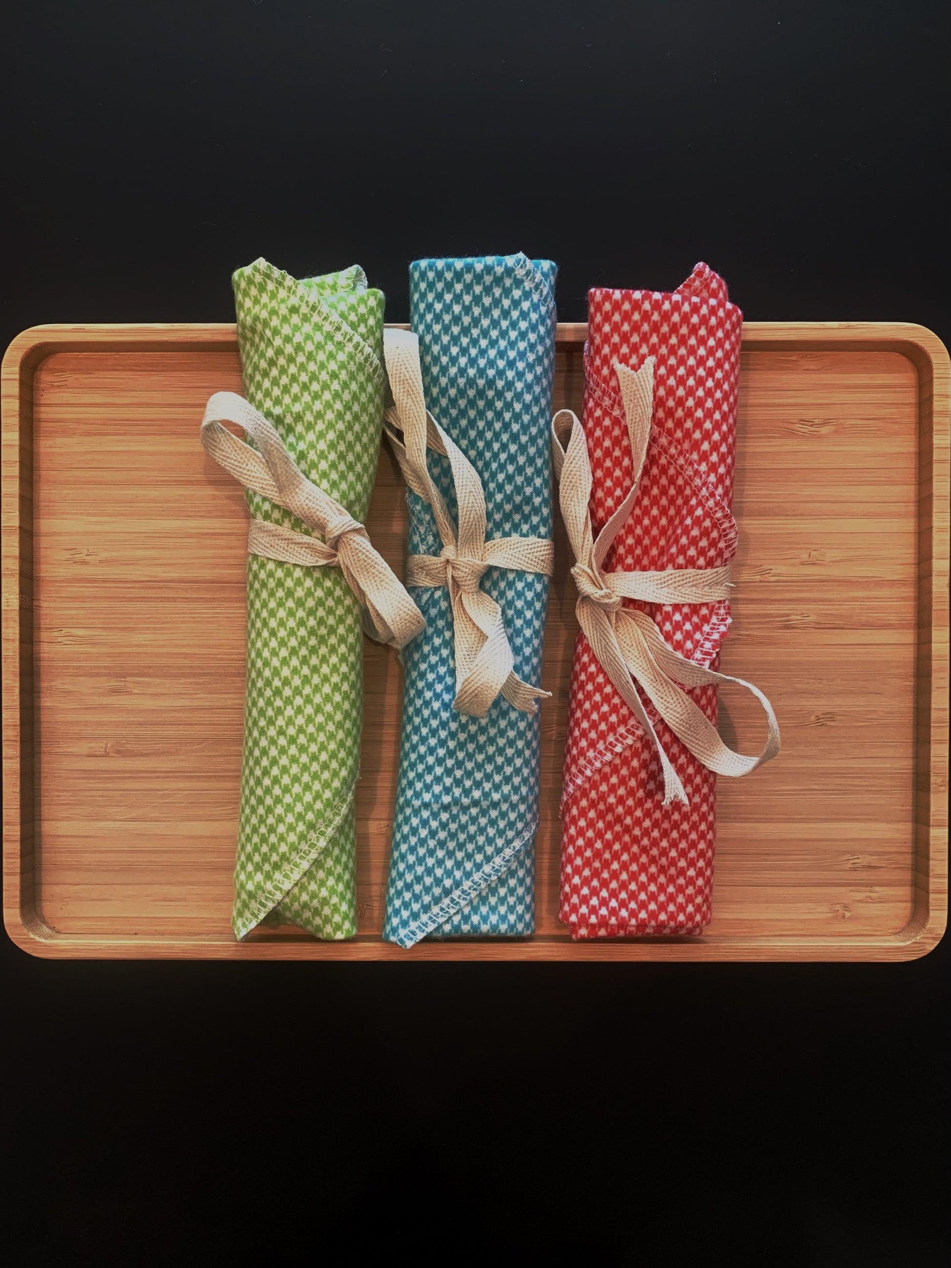Whether you're enjoying a picnic, dining out, or eating at the office, our Cutlery Wrap (and/or napkin, and/or placemat) is a must-have. Keep a set in your vehicle and in your handbag or briefcase so you never have to use single-use cutlery again!